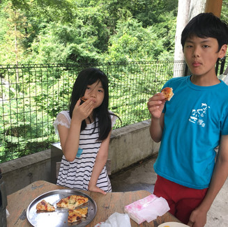 2日目の始まりはピザ作りから!!! 朝食からピザ窯で焼く、手作りピザなんて贅沢すぎる(≧∀≦) トマトソースを塗って、好きな具材をのせて、オリジナルのピザ作りを楽しんだね☆